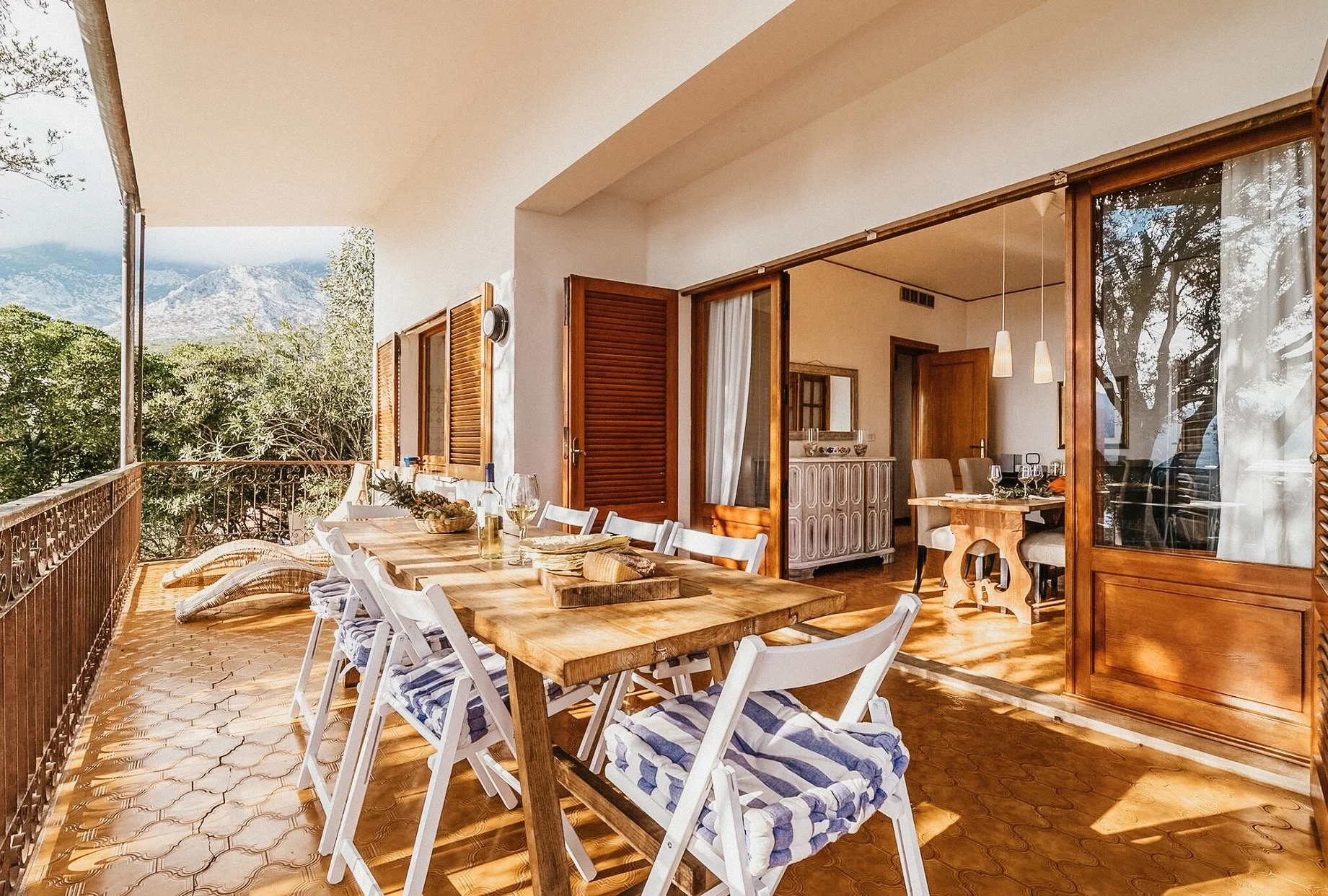 We are at the top of the old town, up these little charming winding streets and the villa has high up views overlooking the sea in front of us, and the mountains behind us.